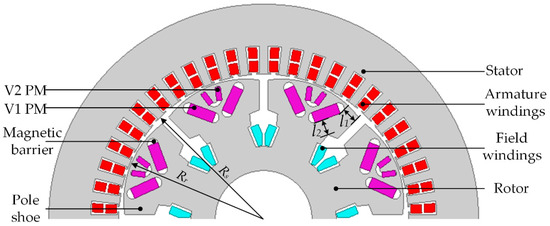 Figure 1 shows the two-dimensional structure of the motor. V1 PMs are embedded in the middle of the outer side of the salient pole core in such a way that the N poles and S poles are alternately arranged on each salient pole. V2 PMs are sequentially embedded in the outer side of V1 PMs. The outside polarities of V1 PMs and V2 PMs in a single salient pole are the same. The rotor core consists of an even number of non-arc pole shoes. The excitation winding is wound on the salient poles in series. The stator is similar to that of a traditional PMSM and is built in a three-phase distributed armature winding. The permanent magnetic pole on the rotor is regarded as the structure of the embedded double radial magnetic pole. Two V1 PMs together provide air-gap magnetic flux for each pole, which brings about a clear magnetism effect. The V2 PM is designed in the outer middle of the V1 PMs, which can increase the main air-gap magnetic flux and avoid the problem of sinking at the output voltage peaks. Rs and Rr are the radius of the stator core and rotor core, and l1 and l2 are the lengths of the magnetic bridges at the corresponding positions.