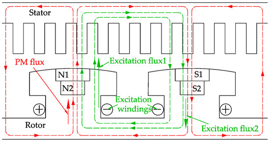 Figure 2 describes the operating principle of the HESM. When starting and driving at low speed, the flux is provided only by the PMs for the output torque; that is, only PM flux exists in the magnetic path. It can be seen that the PM flux combined with non-arc pole shoes is beneficial to adjusting the distribution of the air-gap flux density flexibly, so that the sine degree of the air-gap flux density waveform can be improved greatly. When operating under high torque conditions, the electrical flux created by excitation winding passes through the magnetic bridges on the left and right sides of the PMs and enters the air-gap; that is, electrical and PM flux are in parallel. With the increasing of the excitation current, when the magnetic bridges are saturated, part of the electrical flux can pass through the PMs directly into the air-gap; that is, electrical and PM flux are in series. It can be seen that the flux of the air-gap can be adjusted by changing the excitation current to achieve the adjustment of the speed and output torque.