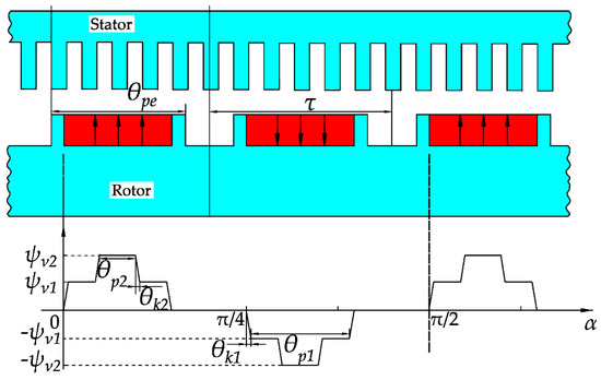 Since the corresponding mechanical angle of each magnetic pole is π/4, the period of the MMF is π/2. According to the principle of the minimum reluctance, the two peaks of the MMF are separately provided by V1 and V2 PMs, respectively. Thus, for the the proposed new topology, when the number of pole pairs is p and ν/p = 1, 3, 5,…, the amplitude of the rotor MMF is