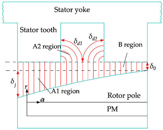 Figure 4 shows typical magnetic field lines at different locations in the HESM. It can be seen that the air lengths of different regions in the magnetic circuit are different. In the A1 and A2 regions, the air lengths can change with the position angle α. In the B region, the air length does not change with the position angle α. δj and δ0 are the air lengths of the pole shoe and air-gap, respectively, and δd1 and δd2 are the air lengths of the stator slot.
