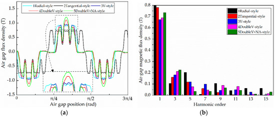 Figure 8a shows that the air-gap flux density amplitude of the spoke-type motor is the lowest. The reason for this is that part of the magnetic flux directly passes through the rotor core to form a closed magnetic leakage circuit. The air-gap flux density waveforms of the flat-type motor and the spoke-type motor are wider at the top, presenting rectangular or square waves, and those of the V-type motor and the flat-type motor are almost the same; however, the amplitude in the V-type motor is slightly increased. In the dual-V-type motor and dual-V-type motor with non-arc pole shoes, the width of the waveform at the top is reduced significantly, and the sinusoidal degree is obviously better than that of the first three motors. As shown in Figure 8b, in the dual-V-type motor with non-arc pole shoes, except for the third harmonic, the remaining harmonics decrease obviously. These results are consistent with the theoretical analysis in Section 3. Since the dual-V-type motor with non-arc pole shoes combines the dual effects of magnetization and drag reduction, the effective value of the air-gap flux density reaches 0.7 T.