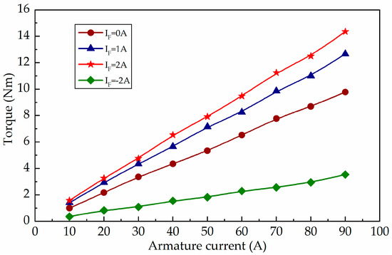 Table 3 and Figure 15 show the experimental external characteristics of the prototype with excitation currents of 0A, 1A, 2A and −2A, respectively. It can be seen that, for a given excitation current, the output torque increases linearly with the increasing of armature current. For a given armature current, the output torque increases obviously with the increasing of excitation current. With a rated armature current of 87 A (rated value), the excitation current is 2 A and −2 A, and the output torque is increased by 42.3% and decreased by 59.8%, respectively, compared to the torque tested without the excitation current. It can be found that the prototype has good load capacity.