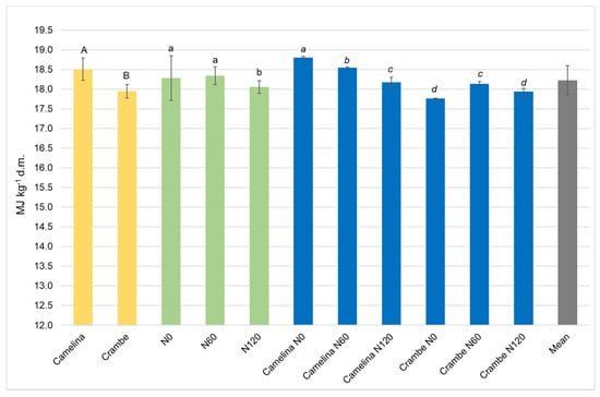 Higher heating value of camelina and crambe straw depending on fertilization rate; error bars-standard deviation; letters indicate that values are statistically different (Tukey’s test at p < 0.05).