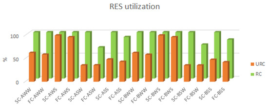 Results of the scenarios [A—2030, B—2050, period of the year (W—Winter, S—Summer), day (W—Wednesday, S—Sunday)]; RES utilization.