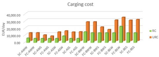 Results of the scenarios [A—2030, B—2050, period of the year (W—Winter, S—Summer), day (W—Wednesday, S—Sunday)]; Charging cost.