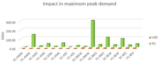 Results of the scenarios [A—2030, B—2050, period of the year (W—Winter, S—Summer), day (W—Wednesday, S—Sunday)]; Impact in maximum peak demand.