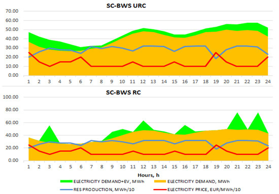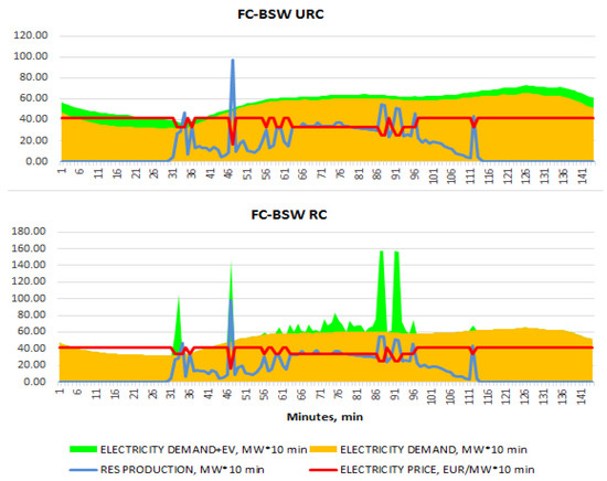 RES production is higher in the winter period than in the summer period. The reason is the installed capacity of wind turbines which is assumed to be much higher than the one for PV. Since the Dubrovnik region has a higher demand during the summer period, it would probably be better to focus its production on PV, as solar potential is higher during summer period and wind potential is lower. The percentage of RES utilization is given in Figure 2 and it presents the amount of daily EV demand for charging, given in the Table 8, which has been supplied with the electricity produced by RES. The amount of total daily EV charging demand is the maximum amount of energy that can be utilized by EVs, rest of it goes to CEEP. Regulation of EV charging leads to a higher RES utilization in all scenarios, when compared to URC, although, in scenarios FC-AWS, -ASS, -BSW, -BSS, RES utilization did not reach 100%, meaning that the rest of the EV demand should be supplied by imported electricity. This can mean that the RC FC has less opportunities to utilize electricity from RES, when compared to RC SC, but we can see that this happens in summertime when RES electricity production is lower and most of it comes from the Sun which intermittency is not that high as the one from wind. The diagrams in Figure 5 show the comparison of URC and RC for FC scenario. The results also show that in the scenarios SC-AWS and SC-BWS the entire EV charging demand is supplied by RES in the case of URC and RC. There is also little difference in the scenarios for FC. The reason for that is a high and constant production from RES during the day. This leads to a mostly constant electricity price during the day resulting in no difference between URC and RC, as shown in Figure 6.