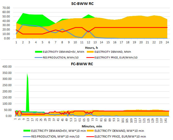RC of the FC model results in a higher total cost for EV charging, when compared to the SC model, in all scenarios except for AWW RC and BWW RC. The reason for such a result is a high production from RES during the night causing high EV charging demand during the night when the electricity price is low, as shown in Figure 7. The highest difference in total costs between FC and SC can be seen in the BSW scenario, where FC has much higher total cost. The reason for that is lower RES electricity production which is mostly constant during the day due to the higher production from PV, as shown in Figure 5. The rest of the scenarios do not differ much between total costs.