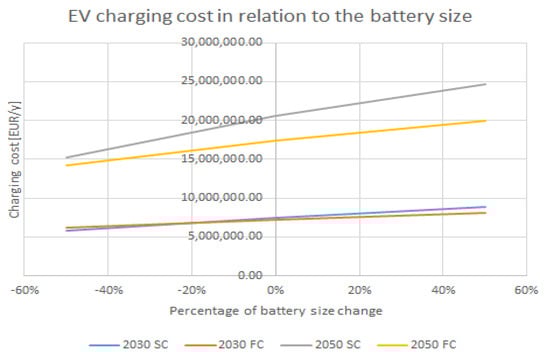 The most relevant parameter for the sensitivity analysis is the battery storage capacity, which is described by elaboration of Equations (10) and (11). Battery storage capacity is chosen because the model response is more complex than in the case of electricity price, where the model response is proportional. Changes in the storage capacity are analyzed for the range of −50% storage capacity (smaller batteries or less availability) to +50% of storage capacities. Results of the analysis regarding the cost of EV charging is given in Figure 8. It can be noted that in 2050 the cost of EV charging diverges more sharply between SC and FC in comparison to the scenarios for 2030, due to the higher share of RES in more time frames.