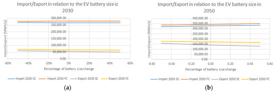 Import/Export in relation to the EV battery size for: (a) 2030 and (b) 2050.