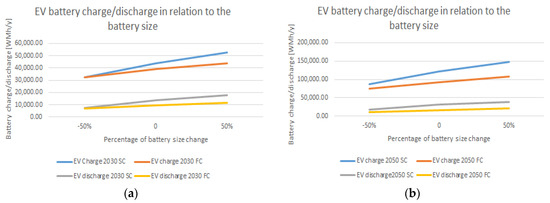EV battery charge/discharge in relation to the battery size for: (a) 2030 and (b) 2050.
