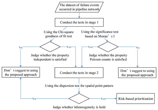 To suggest better practice for wireless sensor network deployment, our approach is represented in a rigorous and confident manner, as shown in Figure 1. Three statistic tests were first conducted in two stages, which guaranteed that the inhomogeneous Poisson point process is a rational application for modelling the location dataset of pipeline failure events. Based on that, the properties of the inhomogeneous Poisson point process were applied to estimate the probability of the failure occurrence in different deployment regions. Afterwards, the rest of the procedures of risk-based prioritization were executed, and the risks in different deployment regions were obtained. Finally, the different deployment regions were ranked in the order of risk.