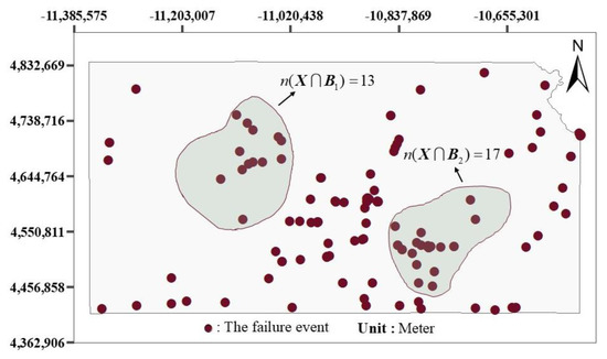 There is a growing body of contemporary data about where an individual pipeline failure event occurs. It provides new opportunities to study the spatial pattern of failure occurrence in a pipeline network. The observed spatial locations of the failure events in a pipeline network can be viewed as data in the form of a set of points, irregularly distributed within a region of space (as is shown in Figure 2). As one of the spatial statistics technologies, spatial point process is widely used to analyze spatial point data [34,35,36]. The inhomogeneous Poisson point process, being one of the models in the spatial point process [37,38,39], was applied in our approach to assess the uncertainty of risk.