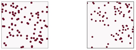According to the properties, the probability of observing failure events occurring in any region, , can be described by the Poisson distribution, which is generally represented as Equation (1). The quantity is the expected number of failure events occurring in Region , which is calculated by Equation (2) with the intensity . The intensity is interpreted as the average number of failure events occurring per unit area. If the intensity is spatially varying, it is called an inhomogeneous Poisson point process, which is used to distinguish from the homogeneous Poisson point process where the intensity is constant. The difference between the homogeneous and inhomogeneous Poisson point processes can be observed in Figure 3.
