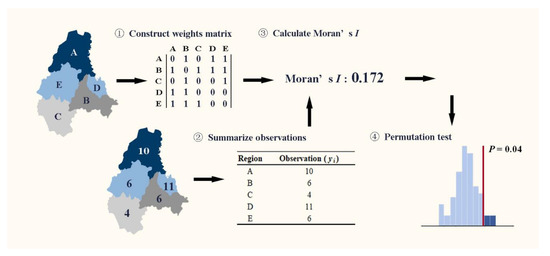 As a commonly used spatial statistic to describe spatial autocorrelation, Moran’s I measures the degree to which observations (the number of pipeline failure events in this study) at different spatial locations (the different regions or parts of a pipeline network in this study) are similar to each other. Its calculation is based on two categories of information—the observation and the location. Here, the observation information included the numbers of pipeline failure events in different regions, often denoted by for Region i. The location information is represented by a spatial weights matrix, and the dimensions of it are ( being the number of regions). Here, the element of the spatial weights matrix, , reflected the level of spatial proximity in two different regions of pipeline network, which is generally given by 1 if Regions i and j are neighbors and 0 otherwise. With both observation and location information, the observed value of Moran’s I can be calculated by Equation (5). In general, the observed value of Moran’s I will be compared with the expected value of Moran’s I. The expected value of Moran’s I can be obtained by . If the observed value of Moran’s I were significantly larger than the expected value of Moran’s I, it indicates a positive spatial autocorrelation; If the observed value of Moran’s I were significantly less than the expected value of Moran’s I, it indicates a negative spatial autocorrelation. If there were no significant difference between the observed value of Moran’s I and the expected value of Moran’s I, it indicates a spatial independence.