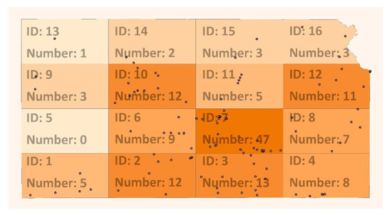 In this section, we describe a case study of the wireless sensor network deployment in the Kansas state pipeline network. The area of the whole pipeline network is 346,647.9 km2, which has approximately 47,388 miles of pipeline. In this case study, sixteen sensor fields are required to get the right priority of wireless sensor network deployment by using the proposed approach. The data used in the case study were provided by the Pipeline and Hazardous Materials Safety Administration (PHMSA). They included 141 failure events of pipeline across Kansas during 2010–2016, and the spatial distribution of those failure events is shown in Figure 2. The information about each failure event contained in the data is described in Table 3. The identification number and the number of failure events that occurred in each sensor field are illustrated in Figure 5.