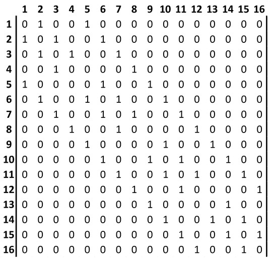 The second test in stage one is the significance test based on Moran’s I, where the independent property is inspected. The number of failure events that occurred in each region can be checked in Figure 5, and the spatial weights matrix is shown in Figure 6. Based on that, the computation of Moran’s I and a significance test were implemented. The result is summarized in Table 4. Although the observed value of Moran’s I was larger than the expected value, the p-value was not statistically significant. It means that there is no significant difference between the observed value of Moran’s I and the expected value of Moran’s I. Therefore, the null hypothesis could not be rejected. It is quite possible that the number of failure events in different regions was the result of randomness. Therefore, we think the independent property was held.