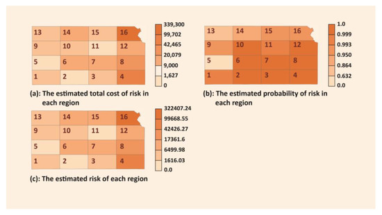 On top of that, the result was obtained with the consideration of the area of the sensor field. Based on the critical sensor density (the minimal required number of nodes per unit area for complete area coverage), the information on the area was very helpful in deciding how many nodes would be needed to completely cover the sensor field. Then, the deployment cost of every sensor field could be reasonably estimated. At the same time, we can view the calculated risk as the expected loss occurring in each sensor field [47]. We can determine the economy of the wireless sensor deployment in each sensor field through a comparison with the deployment cost. Therefore, by observing the spatial distribution of risk in Figure 7c, wireless sensor network deployment in some regions would be more economic than in others, such as Sensor Fields 16 and 4.