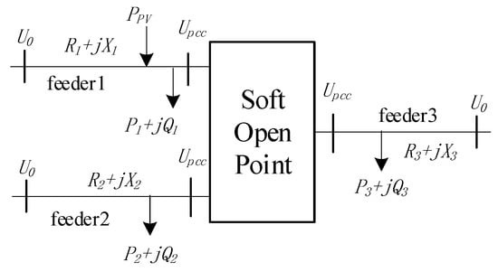 The feeder model mentioned above is simplified as shown in Figure 3. All the loads after the photovoltaic access point of feeder 1 are equivalent to , and the equivalent feeder line impedance is . In this paper, we consider the worst situation for renewable generation. The reactive power output of the inverter is neglected, and the active power is the dominant output. The photovoltaic access power is equivalent to PPV. The line impedance of feeder 2 is R2+jX2, and the load equivalent is . The line impedance of feeder 3 is , and the load equivalent is .