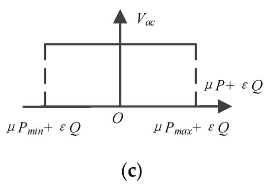 Figure 5a is classified as the active power regulation curve, adjusting the d-axis current () in Figure 4. It mainly ensures the internal DC voltage of SOP is stable. Figure 5b is the active power regulation curve, adjusting the q-axis current () in Figure 4. It mainly ensures the external AC voltage of SOP is stable. It can be inferred that the reactive power should mainly suppress the voltage at PCC of the feeder. However, this control method only make sense in a low r/x distributed network. In the high r/x distributed network, the fluctuation of active power will cause more voltage to be unstable. Therefore, a hypothesis is formulated that a mixed control strategy would perform better, as shown in Figure 5c. There are two undetermined coefficients and , which will be calculated in the next section.