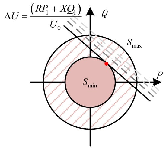 The power circle is an effective method for analyzing the SOP. As shown in Figure 6, the outer circle enclosure area is the maximum apparent power of the converter, and the family of functions in the diagram is the corresponding compensation function under different voltage drops . Under the limitation of the maximum apparent power and compensation curve, the minimum apparent power utilization of the converter is the red point, where the apparent power circle is tangent to the compensation function. In other words, when the static working point satisfies Equation (13), the converter achieves the minimum apparent power condition: