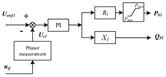 Therefore, in the design of a local control strategy, active and reactive power regulations share a voltage loop. As shown in Figure 7, the phasor measurement takes the time-domain voltage into the aptitudes of it. Though the PI controller, the outputs are respectively multiplied by the coefficient of Equation (13) to synchronously regulate the voltage.