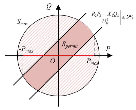 Limited by the fluctuating voltage of feeder 2, the active power transmitted by SOP is bounded. As shown in Figure 8, the overlapping part between the equation of the fluctuation voltage limitation and the maximum apparent power is the transmission power feasible region, and the junction point is the transmission active power boundary: and .