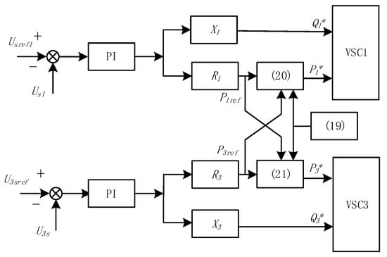 In Equations (20) and (21), P1ref and P3ref are the active power reference values of the voltage control output while and are the reference values of the actual output to the power loop after limitation. Feeder 2 adopts constant DC voltage control, so its active reference values are determined by the demand of VSC1 and VSC3. The complete outer loop control loop is shown in Figure 9. Under this condition, the sum of the transformation active power of the two feeders will not exceed the supportive power limit of feeder 3.