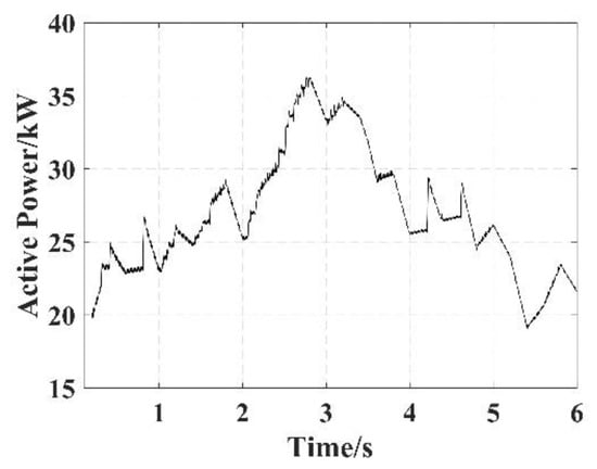 Taking the city office building with photovoltaic self-generating as an example, the characteristic is that the load and photovoltaic power were concentrated. In total, 125 photovoltaic blocks were connected in series and parallel. The maximum output power was 38 kW. Under the condition of random fluctuation of light and temperature, the maximum power tracking algorithm was adopted. The active power output of photovoltaic inverters was obtained by simulation as shown in Figure 10.