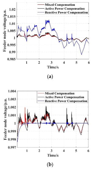 (1) In a low voltage distribution network with the line resistance greater than the inductance, the compensation effect of the active power on the line voltage is better than that of the reactive power. However, if active power compensation is used solely, it will lead to larger pressure on other feeders that derive active power. In Figure 11b, feeder 2 provides active support to feeder 1, and the voltage fluctuation of feeder 2 is 0.7%, the same as that of feeder 2. The voltage fluctuation caused by hybrid compensation is 0.5%. It can be seen that the voltage fluctuation of feeder 1 and 2 is well balanced by mixed compensation.