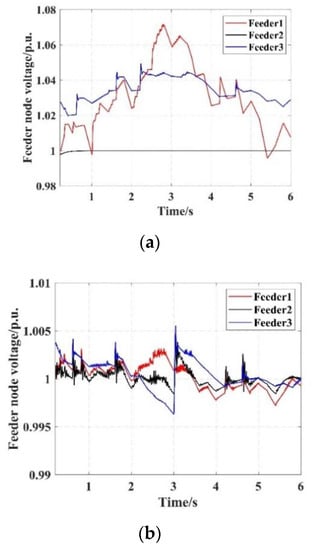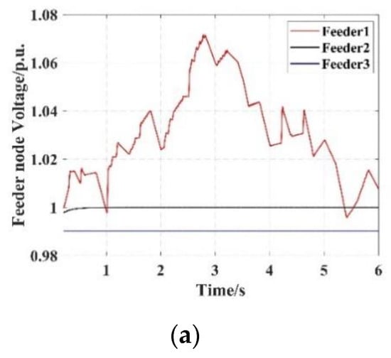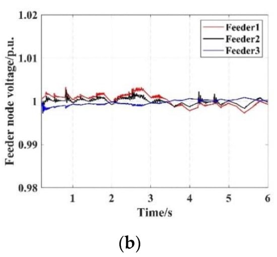 In this simulation example, the feeder 1 was connected to a photovoltaic power generation and feeder 2 and 3 are supportive feeders. As shown in Figure 12a, without soft open point, the voltage fluctuation of feeder 1 exceeded 7%, which risks the voltage exceeding the limit. When the SOP is committed, as shown in Figure 12b, the voltage fluctuation is divided equally into the remaining feeders. As can be seen from Table 1, the standard deviation of feeder 1 was reduced by 92.6%. The active power fluctuation caused by photovoltaic is suppressed.