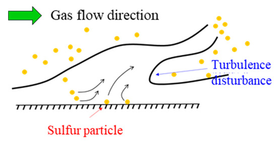 2. The deposition rate of the sulfur particles with different diameters was simulated using numerical simulation. The results show that the mass velocity of the gas flow has little effect on the deposition velocity of sulfur particles, but that a larger diameter of the sulfur particles results in a faster deposition velocity.