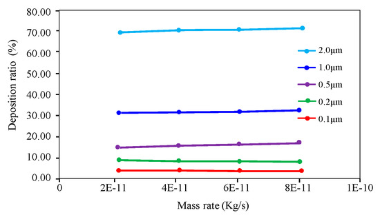 First, the deposition rate of the sulfur particles needed to be determined. The throat pore model was built using ICEM software to simulate the deposition rate of the sulfur particles when gas flow through the throat. In the simulation process, the gas phase was the continuous phase, and the solid sulfur particles were in discrete spherical form in the flowing gas. The Euler Lagrange equation in the software was used to simulate the gas–solid two-phase flow. The purpose of the numerical experiment was to study the deposition ratio at different mass flow rates of 2 × 10−11 kg/s, 4 × 10−11 kg/s, 6 × 10−11/s, and 8 × 10−11 kg/s. Sulfur particles with radii of 0.1 μm, 0.2 μm, 0.5 μm, 1 μm, and 2 μm were simulated for each mass flow rate. The simulation results are shown in Figure 3. The mass velocity of particles had little impact on the deposition ratio of the particles, but the deposition ratio increased with the increase in particle diameter. In the end, the research on sulfur particles by Zhang Guangdong [23] indicated that the average diameter of the sulfur particles is typically 0.5 μm, so the deposition ratio is set to 15% in the simulation process, the average rate for 0.5 μm particles.