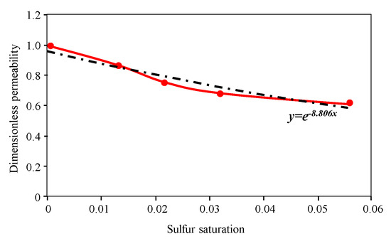In order to measure the damage caused by the deposited solid sulfur to the reservoir, a weighing experiment was designed to measure the change in sulfur saturation at different permeabilities of the reservoir. The permeability of rocks under different sulfur saturations were measured in the lab using core samples. The main experimental steps were as follows. First, a clean core from a sulfur gas reservoir was obtained: a sample with a length of 4 cm and diameter of 2.5 cm was cut from the core. A sulfur solution consisting of CS2 with a sulfur concentration of 0.3% was injected into the core at various pressures to simulate five sulfur saturation levels from 0.00% to 0.06%. Once the outlet liquid flow was stable, the core sample was dried and weighed at each pressure before continuing to the next pressure step. The gas measurement method was then used to calculate the permeability under different sulfur saturation levels of the core. This data was then entered into Equation (7) to determine the degree of damage to the reservoir. A total of five sulfur injection operations were performed on the core. The relationship between the measured permeability and sulfur saturation is shown in Figure 4. According the experimental data and Equation (7), the damage parameter for the model was 8.806.