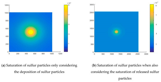From the distribution diagram of sulfur saturation in Figure 6, if only considering the deposition of sulfur particles, sulfur deposition mainly occurred within the 20 m surrounding the wellbore. When considering both sulfur deposition and particle release, the distribution of sulfur saturation decreased compared to the situation that had not considered the particle release. This decreased saturation indicates that a large amount of deposited sulfur particles are released near the wellbore by the gas flowing through the system. Overall formation damage caused by sulfur deposition is estimated to be less when considering released sulfur particles in the model.