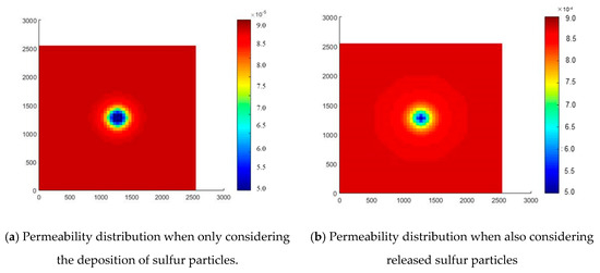 From the permeability distribution diagram (Figure 7a), when only considering the deposition of sulfur particles, the damage of the reservoir was mainly concentrated in an area within 20 m near the wellbore. When considering particle release (Figure 7b), the permeability in the area 20 m near the wellbore was dramatically improved, and the damage to the reservoir is mainly concentrated in the 5 m range near the wellbore. The original damaged area ranging from 5 m to 15 m had been greatly improved, and improvement near the area 5 m near the wellbore was not noticeable. The main reason for this phenomenon is that the suspended sulfur particles and the released sulfur particles were deposited along with gas flow gathering near the wellbore. Although there were a large number of particles released within 5 m of the wellbore, there were also particles gathered and deposited near the 5 m wellbore area at the same time.