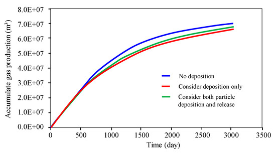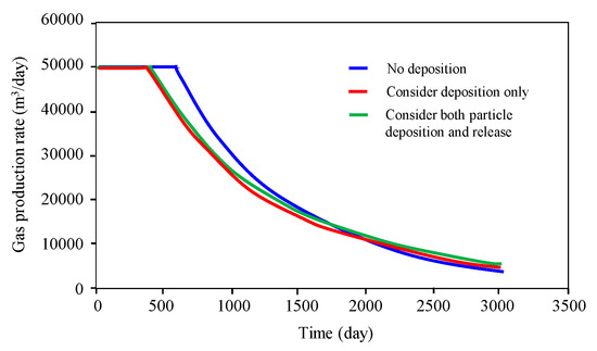 Based on Figure 8, sulfur deposition affects production in three aspects: ① the stable production period shortens; ② the decline period increases; and ③ the decline rate increases. Once the release of sulfur particles is considered, the gas production rate slightly increased and the decline period and stable production period are almost the same as when considering deposition only.