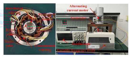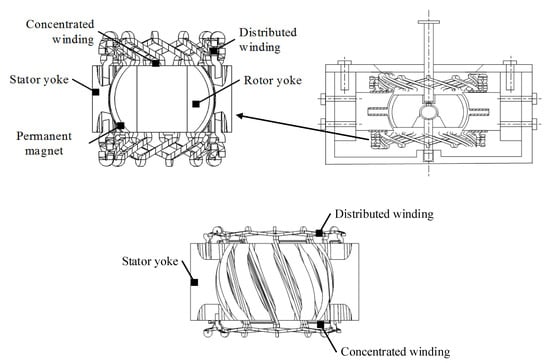 In [8], a doubly salient electromagnetic wind power generator is proposed. The salient structure in its rotor and stator is robust and straightforward. Moreover, its high efficiency, in cases involving considerable power, renders it particularly suitable for DC output and non-grid-connected wind power generation. However, its structure relies on the fixed-pitch stall regulated model, which reduces its efficiency because of wind fluctuations. In [9], a dual stator-winding induction generator was studied that could improve rotor speed stability. Simultaneously, a novel control-winding voltage-oriented drive method was proposed, which provides an additional supplementary control loop for adjusting the braking resistor, to ensure that the braking resistor absorbs all the kinetic energy of the generator and turbine. In [10], a novel passive maximum power point tracking (MPPT) is used in a wind turbine generator. Compared with the conventional MPPT, the novel structure does not use a DC/DC converter or any other electrical control device, making it highly reliable for outdoor use. Although this improvement promotes the reliability and use of the wind turbine generator, it does not focus on the generator. The active power response and grid frequency are decoupled in conventional synchronous generators; however, reference [11] proposed a virtual synchronous generator possessing active frequency regulation abilities; however, the study was only a theoretical project challenging to implement in practice. Reference [12] analyzed the outer rotor axial primary magnetic circuit permanent-magnet generator, which uses the outer rotor to achieve small size and direct coupling. The axial primary magnetic circuit can considerably improve the sensitivity gap, so that the key technology becomes easier to achieve. However, this model is only suitable for small-sized wind turbine generators.