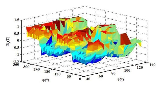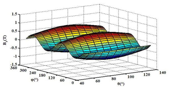 As the generator is radially magnetizing, we exclusively focus on the analysis of . Moreover, if we exclusively consider the fundamental wave, the air-gap component changes in the direction of with the sinusoidal wave. Figure 3 shows the plot, wherein two positive and negative peaks are observed across the equator, which agrees with the structure of the four-rotor magnetic poles. When , the air-gap magnetic density is the largest; thus, the closer the position is to the equator of the rotor magnetic pole, the greater the magnetic density. The amplitude of is approximately 0.5 T.