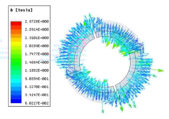 At the boundary between the air-gap region and the permanent magnet radius (r = ), as well as at the boundary between the rotor core and the permanent magnet body radius (r = ), the tangential components of the magnetic field and magnetic induction intensities are continuous. That is: