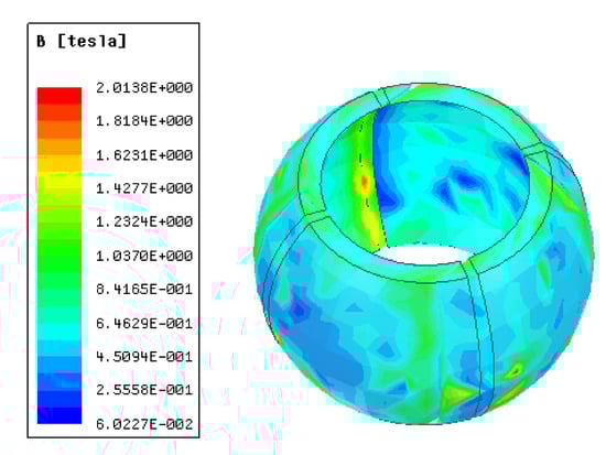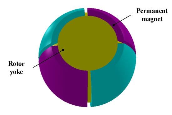 A permanent-magnet rotor multi-degree-of-freedom (multi-DOF) generator can realize multi-DOF motion of the output shaft and considerably simplify the mechanical structure, while improving the response speed and positioning accuracy of transmission systems [13]. Therefore, the application of multi-DOF generators in the field of wind power generation has become a research topic receiving considerable attention. In [14,15], the magnetic field and modeling analysis of a multi-DOF deflection generator are proposed via analytical and finite element methods. The size of the permanent-magnet generator and material were determined via calculation. The rotor had a butterfly structure in [14], and the corresponding result shows that a butterfly-shaped permanent-magnet rotor multi-DOF generator can effectively enhance flux density and torque magnitude of the spin-rotation. In [16,17], rotor dynamics characteristics were analyzed, based on which, a mathematical model of the rotor under free state was established, and the results of the finite element and analytical methods were compared to verify whether rotor material rigidity affects the critical speed. Reference [18] shows the electromagnetic, thermal, and solid fields of the multi-DOF permanent-magnet motor, together with a multiphysics coupling analysis of the motor. The temperature increase and stress–strain of the designed structure were obtained via a simulation of the magnetic–thermal–solid coupling, considering the electromagnetic structure as the research object.