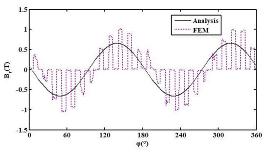 According to Figure 7, the air-gap component changes in the direction of with the sinusoidal wave; Figure 7 is nearly identical to Figure 3, obtained through the analytical method.