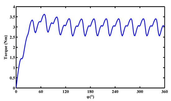 Figure 8 compares the air-gap magnetic flux obtained using the finite element and analytical methods when =. Based on Figure 8, the variation trend of air-gap magnetic flux is nearly identical for both methods, and the amplitudes are similar. The curve appears smooth because the analytical method neglects some factors, having less impact on the model. The finite element model simulates the change in the air-gap magnetic field under regular motor operation; thus, several harmonics exist in time and space. Consequently, the curve of the finite element method appears to be more irregular.