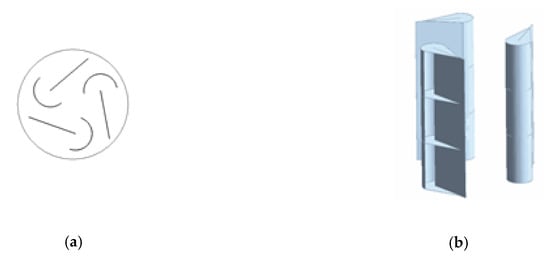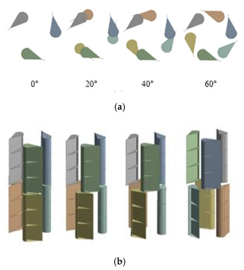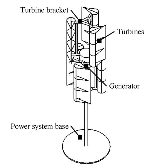 Figure 10 shows the 3D model of the multi-DOF deflecting-type permanent-magnet synchronous wind turbine. The turbine usually comprises of a wind wheel, vertical shaft, bearing, bearing seat, tower, footing, coupling, multi-DOF deflecting-type PMSG, controller, and an inverter [24,25,26]. According to Figure 10, the wind turbine has a double-layer wheel structure, and each layer has three shafts. Figure 11a shows a two-dimensional structural model of the double-layer wind wheel, whereas Figure 11b shows a 3D structural model of the one-layer wind wheel. Table 4 lists the specific parameters of the wind turbine obtained from the measured data of the wind turbine prototype from the wind power laboratory at Hebei University of Science and Technology.