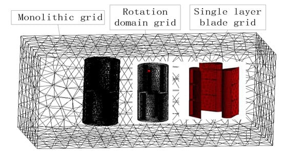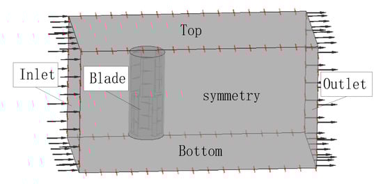 A flow field analysis was performed using the CFX module of the ANSYS Workbench, by simulating the operation of the wind turbine in practical operations. The boundary condition setting is shown in Figure 12. The wind enters through the inlet, with speeds ranging from 2.5 m/s to 13 m/s. The pressure outlet has a static pressure of 0 Pa. The left and rights sides are set as a symmetrical structure, and the top and bottom are set to the wall. After the boundary conditions are established, the meshing is performed. Figure 13 is a schematic diagram of meshing. During the division process, the selected mesh type, grid layout, and algorithm will directly affect the accuracy of the numerical simulation. This study adopts the automatic mesh generation method, which is a relatively classic mesh division method in software. The specific solver parameters are presented in Table 5.