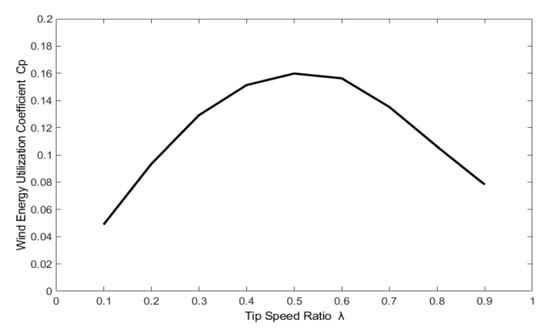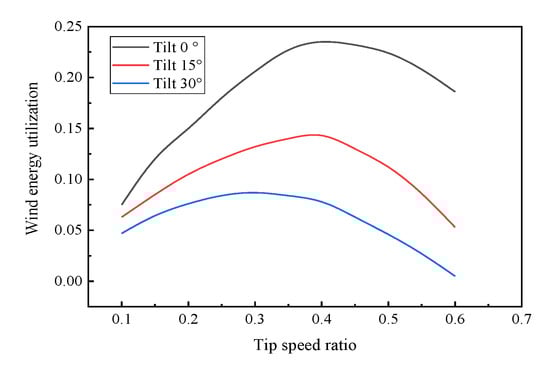 In the calculation process, the wind speed of the inflow airflow was maintained constant at 5 m/s, and the tip speed ratio changed between 0–1 with a variation in the corresponding parameters. Figure 14 shows the variation curve of the wind energy utilization coefficient with respect to the tip speed ratio, which ranges between 0.1 and 0.9; the wind energy utilization rate first increases and subsequently decreases with increasing tip speed ratio. The wind energy utilization coefficient becomes maximum at a tip speed ratio of 0.5. The wind turbine can maintain the maximum utilization efficiency of the wind energy if the rotation speed is stabilized at this value.