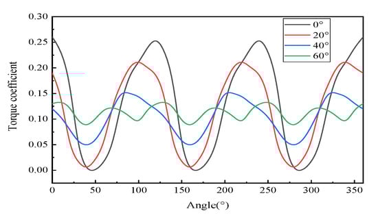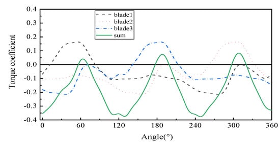Figure 15 shows the torque coefficient comparison curves of the three blades in one rotation period where the torque coefficient curves are roughly sinusoidal, and the sum of the torques of the three blades is considerably more stable than the individual blade torques. Figure 16 shows the torque coefficient comparison curves of the single- and double-layer wind wheels. The torque coefficient of the double-layer wind wheel is stronger and more stable than that of the single-layer wind wheel.