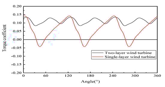 Torque coefficient comparison curves of single- and double-layer wind turbines.