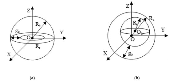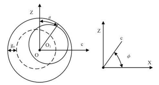 Here, we assume that the spherical coordinates of the rotor are () before rotor deflection. Following rotor deflection, the deflection displacement is significantly smaller compared with the rotor radius displacement. At this point, the expression of the air-gap length in any plane (such as the OCZ plane) in the original coordinate system is given as: