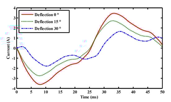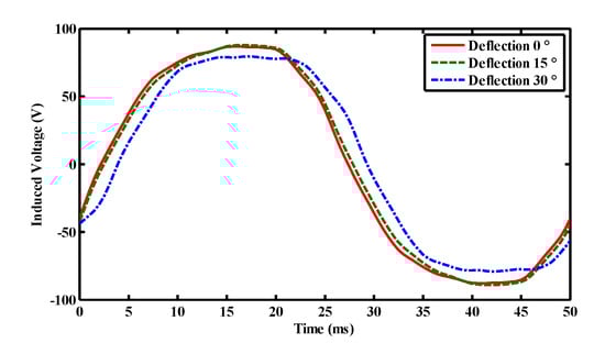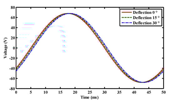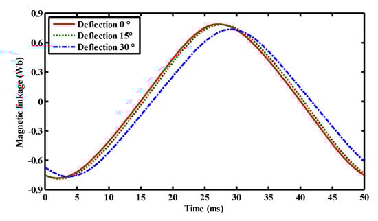 The operation of the generator automatically adjusts when the wind direction changes; hence, the generator has to operate in the electric state for a short duration. The working conditions at rotor deflections of 0°, 15°, and 30° were compared. During the simulation, the unstable state at the startup was ignored. There are three phase windings on stator, which are phase A, phase B and phase C. Considering phase A as an example, the comparison plots of the phase voltage, phase current, flux linkage, and induced voltage are shown in Figure 23, Figure 24, Figure 25, and Figure 26, respectively.